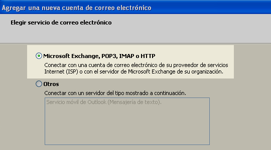 4. Seleccione "Microsoft Exchange, POP3, IMAP o HTTP", esto indica el tipo de servicio de correo que utilizara