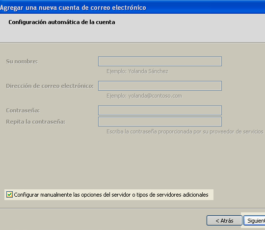 5. En la siguiente ventana Seleccione la opción "Configurar manualmente las opciones del servidor o tipos de servidores adicionales". Luego, haga click en "Siguiente".