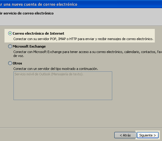 6. En la siguiente ventana especifique el tipo de cuenta que se desea crear. En este caso deberá seleccional la opción "Correo electrónico de Internet". Luego, haga click en el botón "Siguiente"