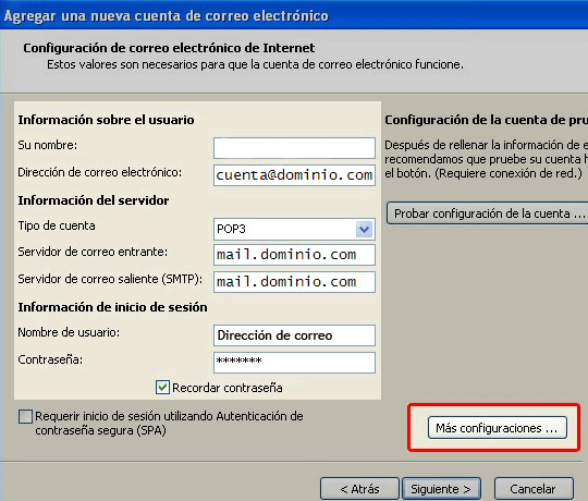 Donde dominio.com debe ser remplazado por su nombre de dominio. Es necesario que deje deshabilitada la casilla de "Requerir inicio de sesión utilizando autenticación de contraseña segura (SPA)". Para proseguir, de clic en el botón "Más configuraciones...".