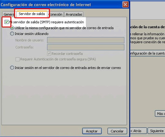 Paso 8 .- Seleccione la pestaña "Servidor de salida", y asegúrese de que la casilla "Mi servidor de salida SMTP requiere autenticación" quede seleccionada, y luego acepte