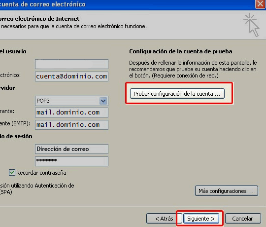 9. Ahora puede probar la configuracion haciendo click en "Probar configuración de la cuenta..." para verificar que la cuenta ha sido configurada satisfactoriamente. Con esto, acaba de configurar su nueva cuenta de correo electrónico en su Microsoft Outlook 2007.