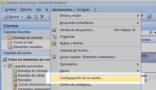 2. En el menu, ir a Herramientas (Tools), y dentro del menu seleccionar Configuración de la cuenta (E-mails Accounts)